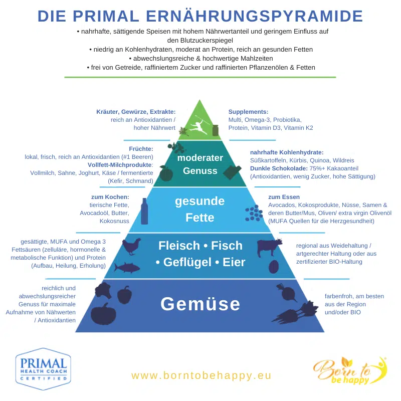 Seit 2017 vermittle ich diese Primal Ernährungspyramide bei Born to be Happy: Gemüse als Basis, hochwertige Proteine, gesunde Fette, wenig Kohlenhydrate. Die neue US-Pyramide bestätigt diesen Ansatz.